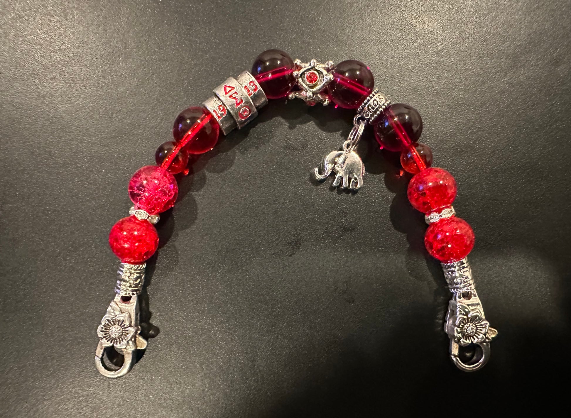 Show your pride and style with this vibrant handcrafted bracelet! Featuring a striking combination of deep maroon and bright red crackle beads, this piece is accented with sparkling rhinestone spacers for extra shine. The bracelet includes silver barrel beads engraved with "1913" and the Greek letters ΔΣΘ, making it a meaningful accessory for Delta Sigma Theta sorority members. A playful silver elephant charm adds a touch of whimsy and tradition, while the ornate silver lobster clasps, each adorned with a floral motif, provide both security and elegance. Perfect for celebrating sisterhood, heritage, and individuality!
