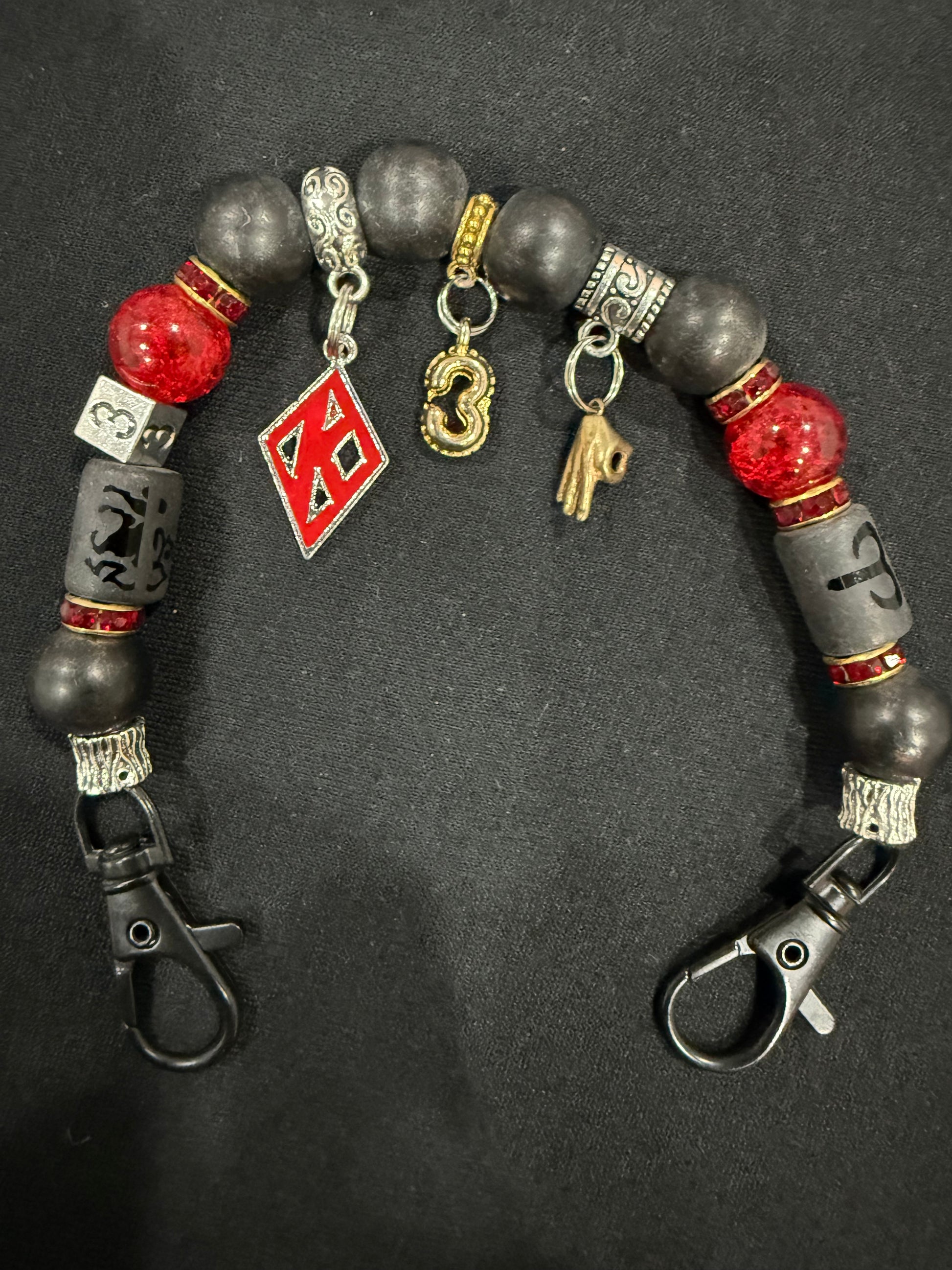 Show off your unique style with this handcrafted bracelet, featuring a bold mix of matte black and vibrant red beads, accented by ornate silver and gold-toned spacers. The design is elevated with three eye-catching charms: a red diamond-shaped charm, a gold and black number "3," and a detailed gold hand, each adding a layer of personality and symbolism. Decorative silver barrel beads and number cubes bring extra detail and meaning to the piece, while sturdy black clasps at each end ensure a secure fit. Perfect for anyone who loves statement accessories with a blend of tradition and flair, this bracelet is sure to stand out in any jewelry collection.