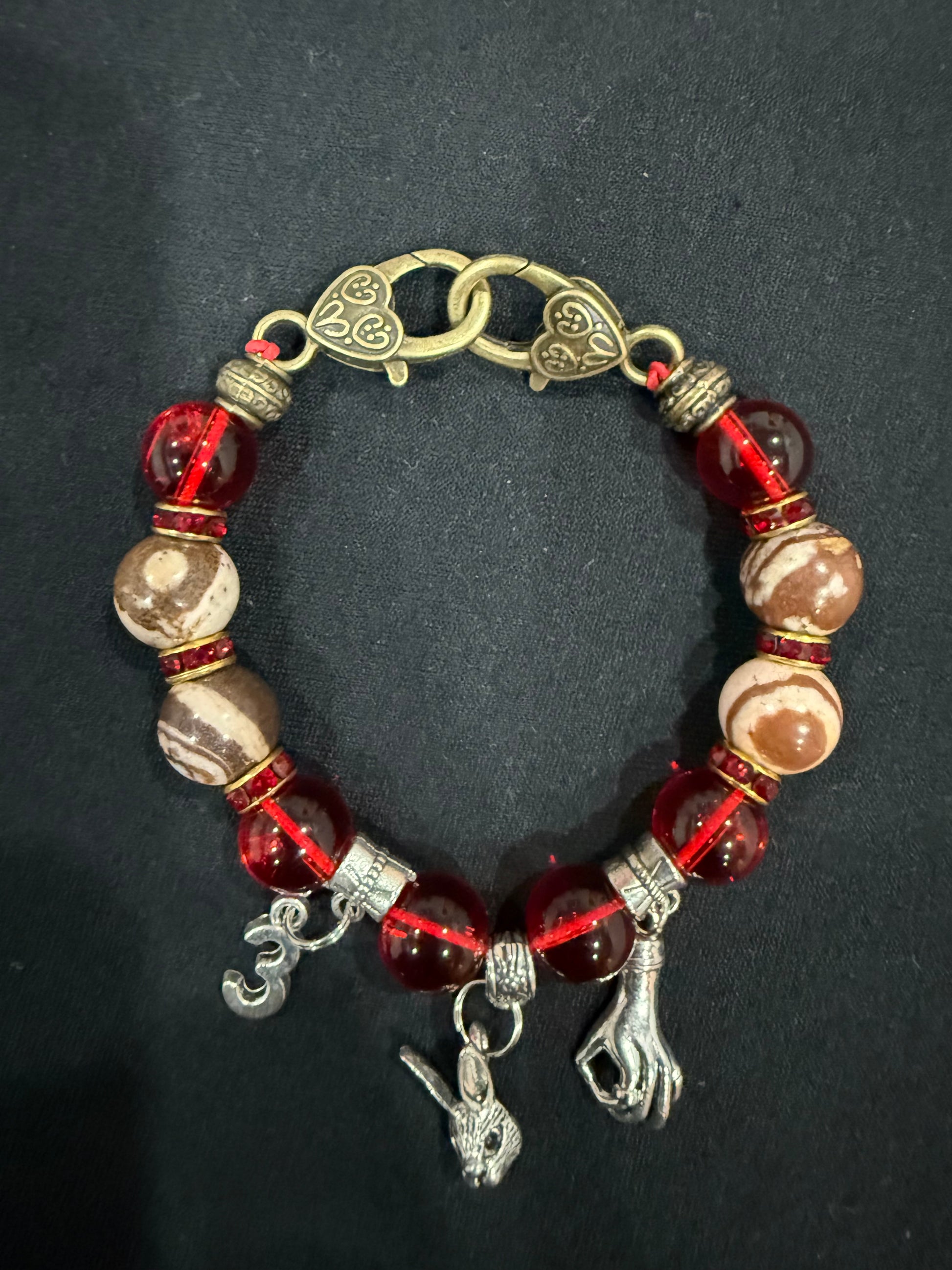 Add a touch of bold elegance to your look with this handcrafted bracelet! Featuring a striking combination of deep red glass beads and earthy marbled brown beads, this piece is accented with ornate gold-toned heart clasps and decorative spacers. Three unique silver charms—a number "3" and two expressive hand symbols—dangle playfully, adding personality and symbolic meaning. Perfect for anyone who loves accessories that blend tradition, style, and a hint of whimsy, this bracelet is sure to stand out in any jewelry collection.
