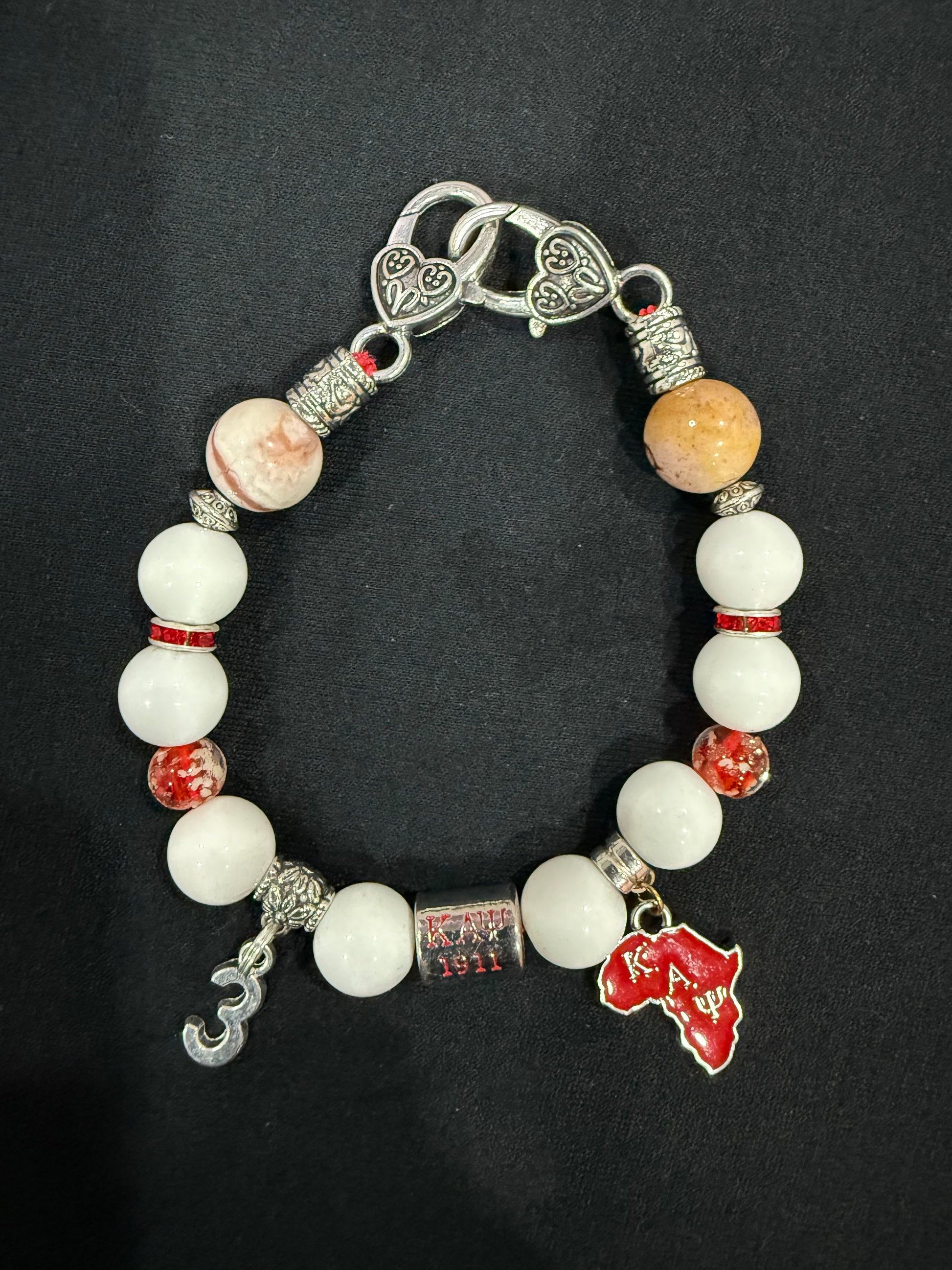 Showcase your pride and heritage with this beautifully handcrafted bracelet! Featuring a mix of smooth white beads and earthy marbled accents, this piece is elevated with ornate silver-toned spacers and heart-shaped clasps at each end. The bracelet is adorned with three meaningful charms: a silver "3," a rectangular charm engraved with "Kappa Alpha Psi 1911," and a striking red Africa-shaped charm with "KAY" in white. The combination of bold colors and symbolic elements makes this bracelet a standout accessory—perfect for anyone who values tradition, unity, and unique style.