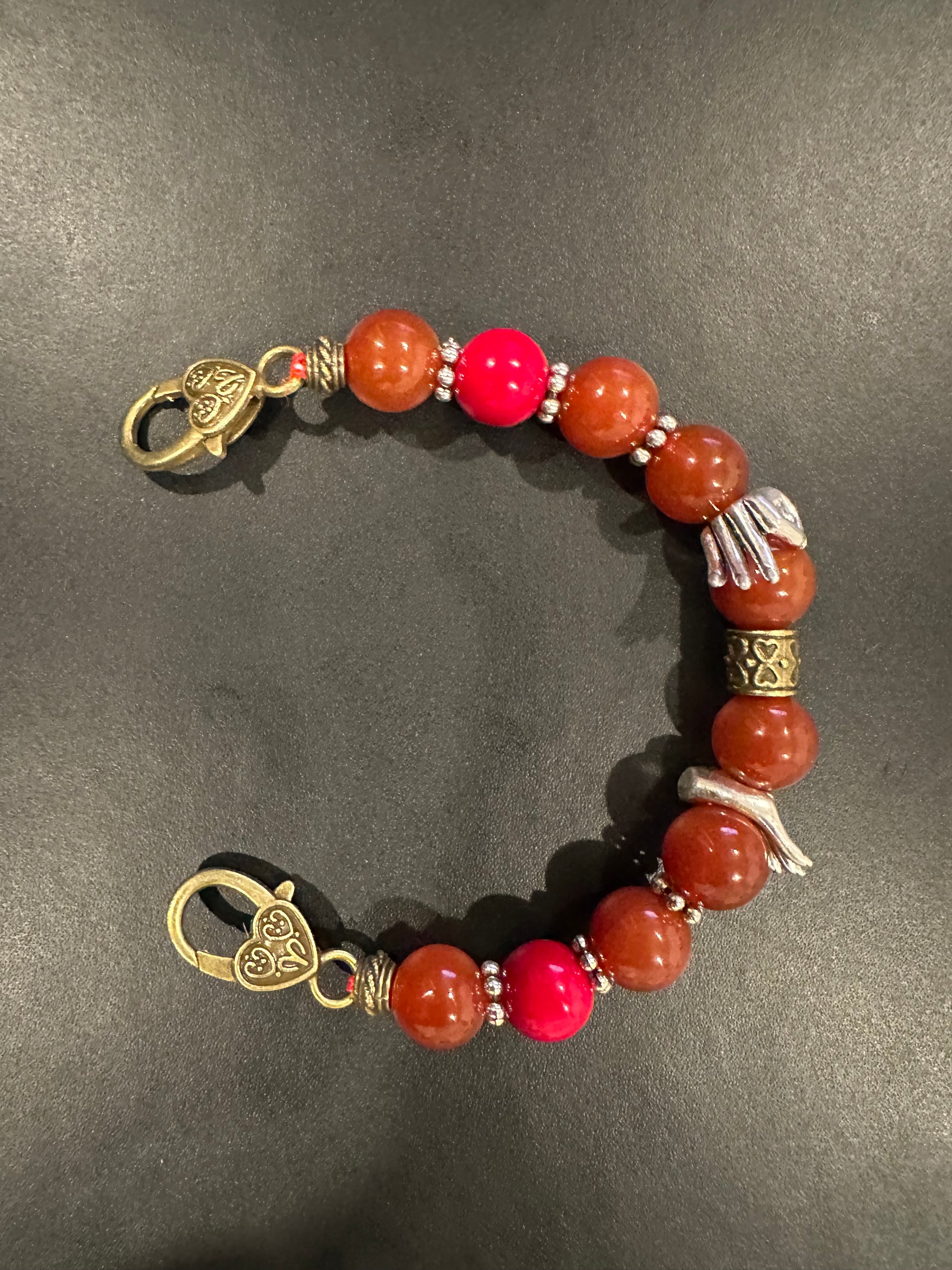 Make a statement with this handcrafted bracelet, designed for those who love bold and earthy elegance! Featuring rich, warm-toned brown beads paired with vibrant hot pink accent beads, this bracelet is both eye-catching and unique. Intricate gold-toned heart clasps add a touch of romance and sophistication, while silver charms—including a detailed hand and a curved accent—bring extra character and meaning. Finished with ornate gold and silver spacers, this bracelet is perfect for anyone who values individuality, empowerment, and meaningful accessories.