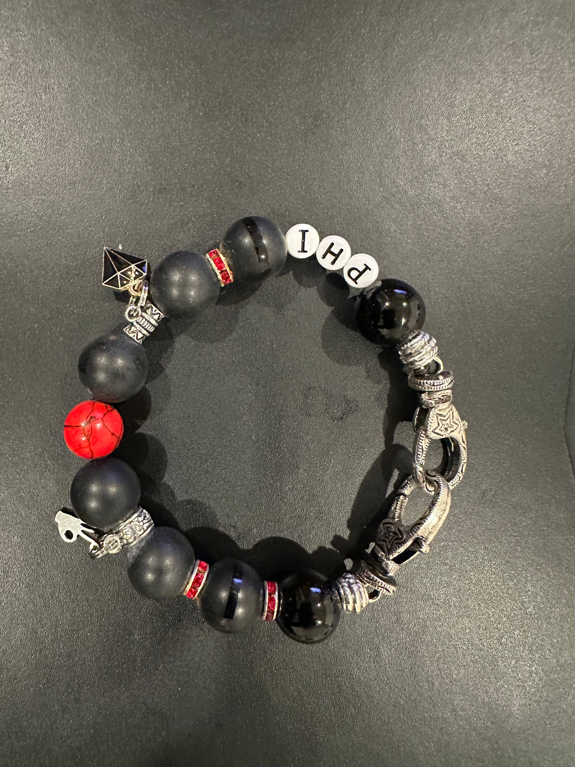 Showcase your pride and style with this bold handcrafted bracelet! Featuring matte black beads accented with vibrant red spacers and a single striking red bead, this bracelet is both eye-catching and meaningful. The design is highlighted by white letter beads spelling "PHI," adding a personalized touch. Unique silver charms—including a geometric shape, a hand symbol, and a detailed clasp—bring extra character and symbolism to the piece. Perfect for anyone who values tradition, individuality, and statement accessories, this bracelet is a standout addition to any collection.