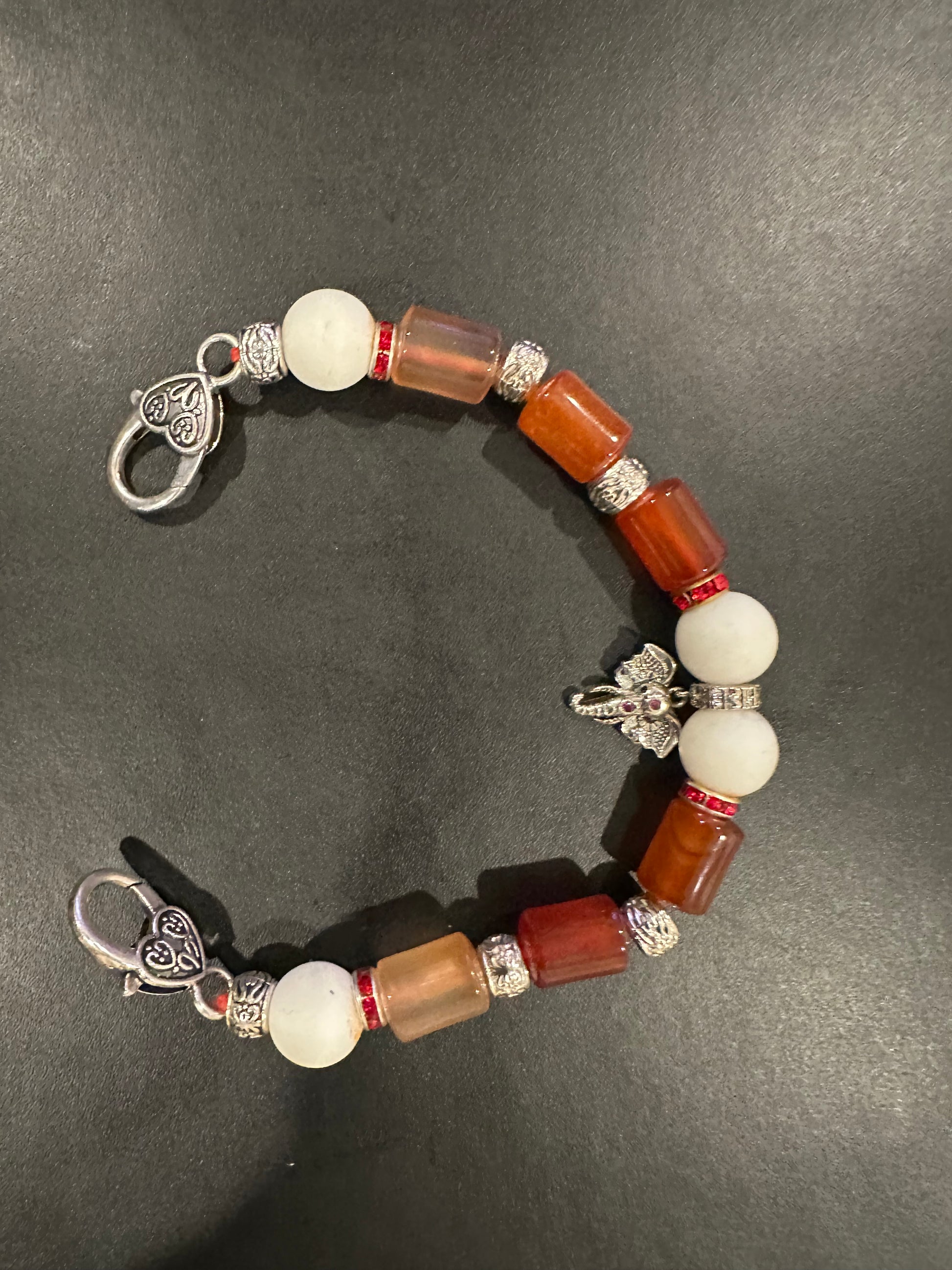 Embrace earthy elegance with this handcrafted bracelet! Featuring a beautiful mix of matte white round beads and warm, rectangular amber-toned beads, this bracelet is accented with intricate silver spacers and pops of red for added vibrancy. The centerpiece is a detailed silver elephant charm, symbolizing wisdom and strength. Finished with ornate heart-shaped silver clasps, this bracelet is perfect for anyone who appreciates unique, meaningful accessories with a touch of global inspiration.