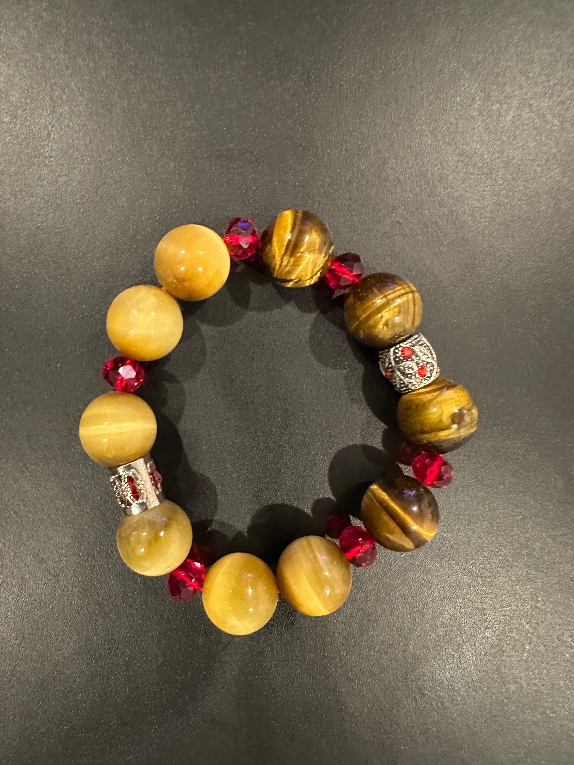 Elevate your style with this striking Tiger’s Eye and ruby-red crystal bracelet! Each golden-brown Tiger’s Eye bead shimmers with natural warmth and confidence, while the sparkling red crystals add a bold pop of color and energy. Intricately detailed silver accent beads bring a touch of elegance and sophistication, making this bracelet a true statement piece. Whether you’re dressing up for a special occasion or adding flair to your everyday look, this bracelet is designed to turn heads and inspire confidence. Let your inner strength and vibrant spirit shine—make this unique accessory yours today!