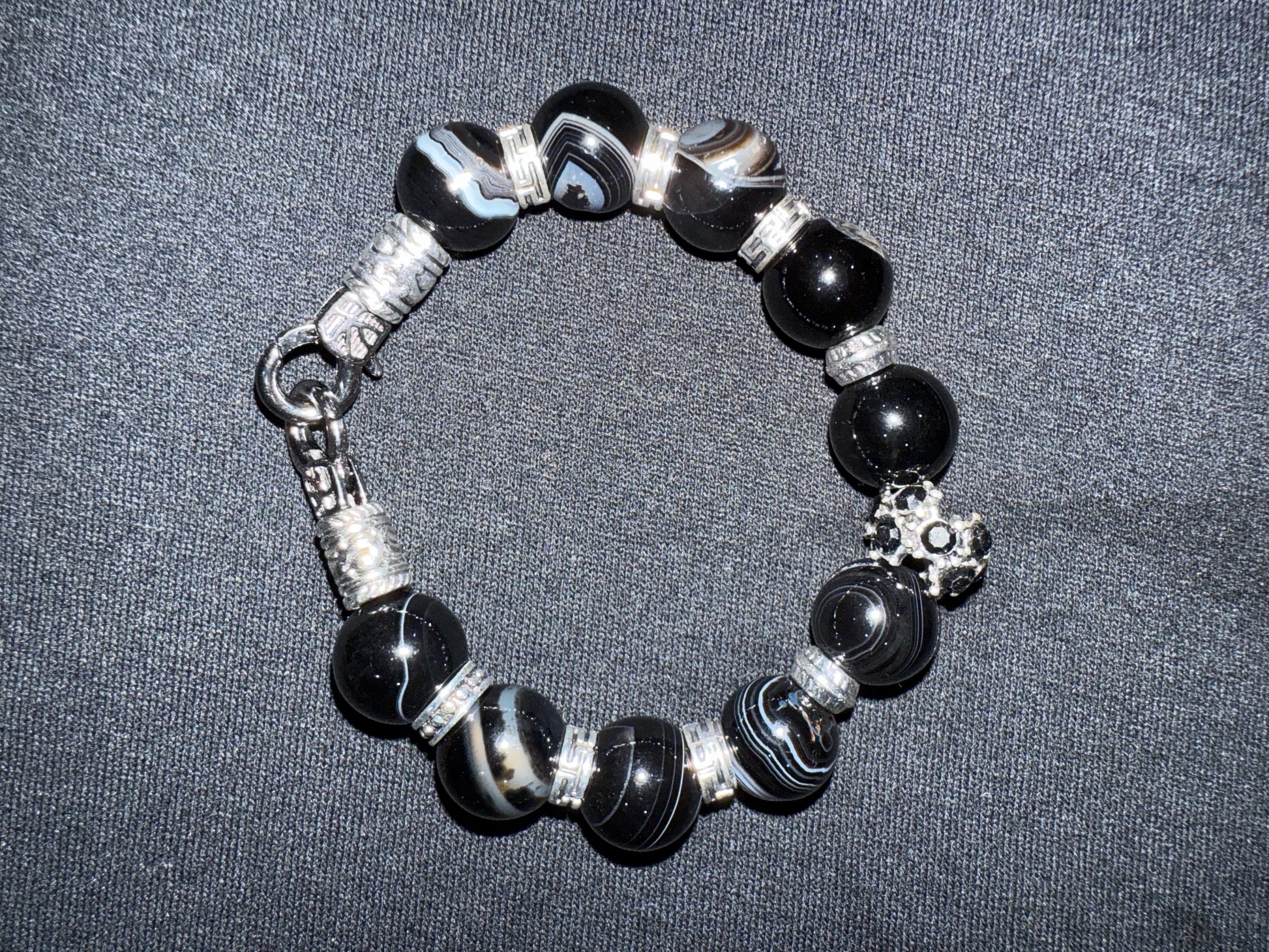 Add a touch of sophistication to your accessory collection with this handcrafted bracelet, featuring striking black agate beads with unique white and gray marbling. Each bead is separated by detailed silver-toned spacers, enhancing the bracelet’s elegant and modern look. A standout silver floral accent bead adds a hint of charm and individuality. The bracelet is finished with a sturdy, decorative clasp for secure and stylish wear. Perfect for anyone who appreciates bold, timeless jewelry, this piece effortlessly complements both casual and formal outfits.