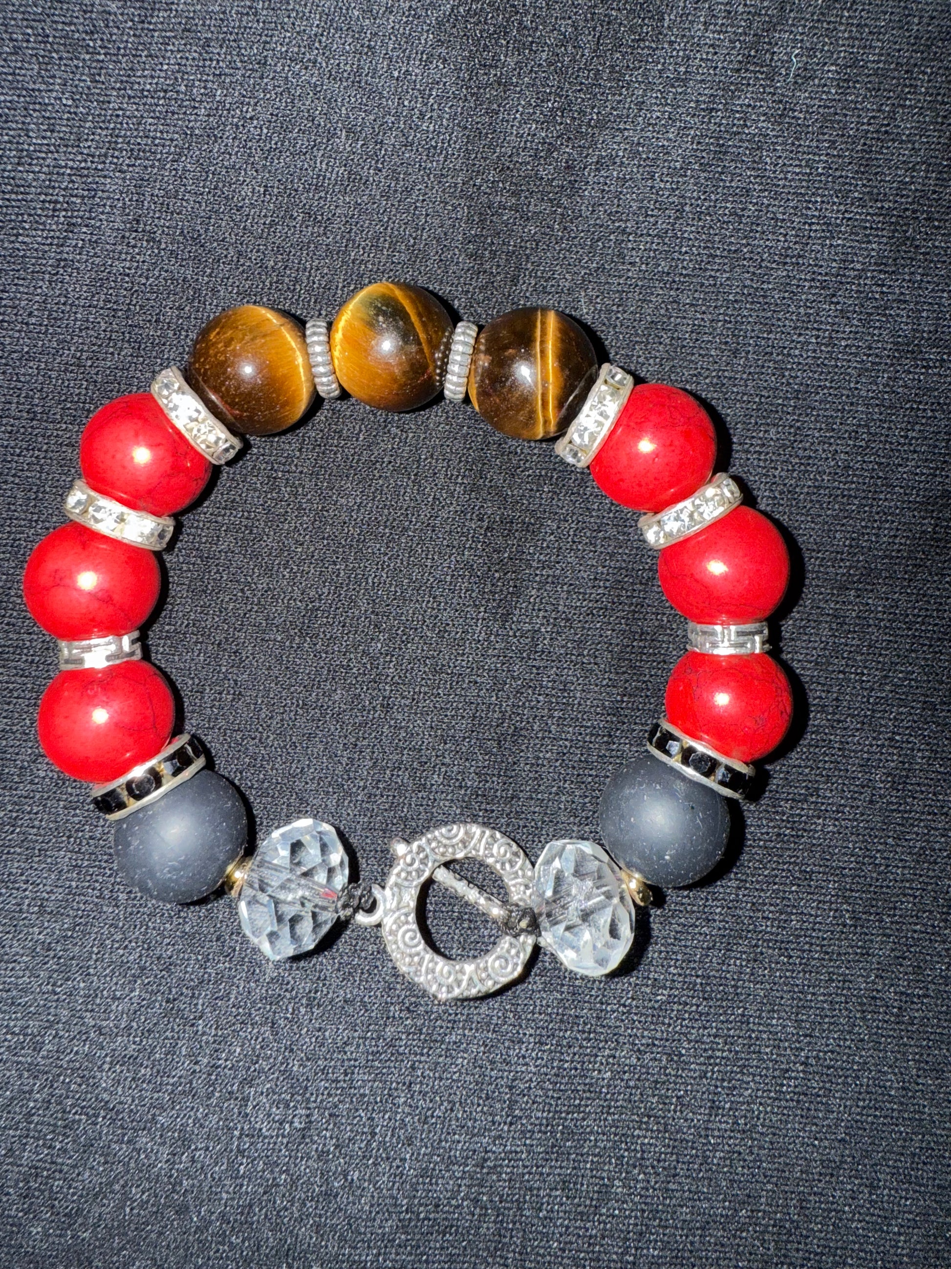 Add a touch of sophistication to your accessory collection with this handcrafted bracelet! Featuring a striking combination of earthy tiger’s eye beads, bold red beads, and matte gray accents, this piece is beautifully separated by sparkling silver-toned spacers. The bracelet is finished with two faceted clear beads and a decorative, rhinestone-encrusted toggle clasp for secure and stylish wear. Perfect for anyone who loves unique, eye-catching jewelry that blends natural elements with a hint of glamour, this bracelet is sure to stand out in any collection.