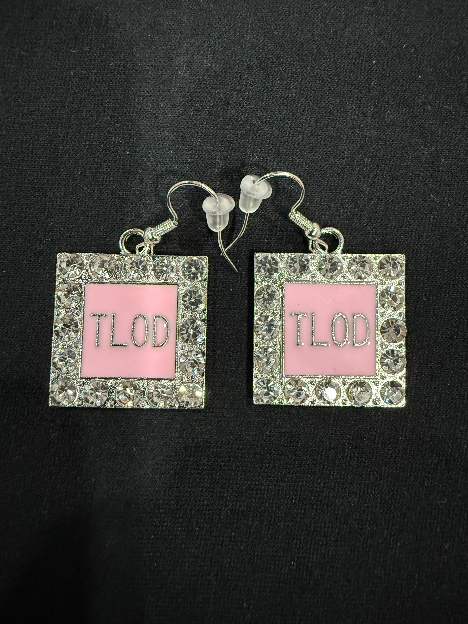 Add a touch of sparkle and pride to your look with these dazzling handcrafted earrings! Each earring features a square design with a soft pink center, boldly displaying the letters "TLOD." The pink centerpiece is surrounded by a border of shimmering rhinestones, creating a glamorous and eye-catching effect. Lightweight and stylish, these earrings are perfect for anyone who wants to showcase their affiliation with elegance and flair. Ideal for special occasions or everyday wear, they make a standout addition to any jewelry collection.